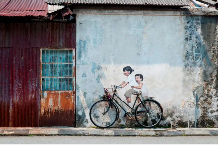 【乔治壁画街】最著名的包括小孩爬墙(Boy on Chair),魔术(Magic),舞狮(Lion Dance),姐弟共骑(Kids on Bicycle),其中两幅壁画小孩爬墙(Boy on Chair)和姐弟共骑(Kids on Bicycle),更 是來自立陶宛的画家恩尼斯绘制。除此,途中可看见两架讲述乔治市文化故事的铁架画:游行(Procession),太狭窄(Too Narrow)。这些壁画述说着当地朴素的生活故事,为古老的槟城古迹区添增一些新气息,令整座老城摇身变成一个艺术大画廊。漫步其中,感受这座充满历史的古城和每个游客低诉的故事。