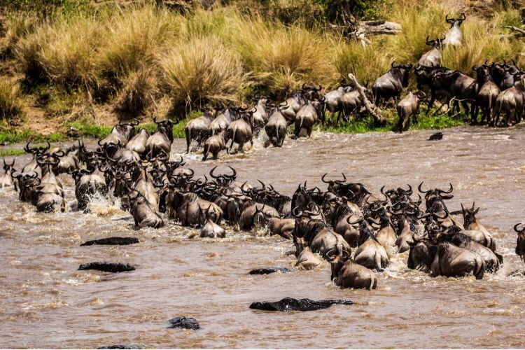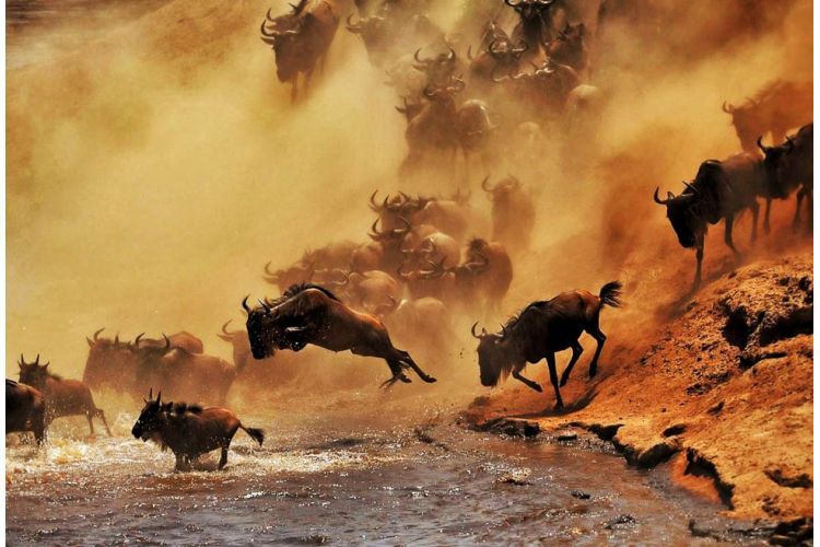 乘坐越野车前往园内追逐动物(8:00 出发-15:00返回),在马拉河等待角马大部队,幸运的话还能看到最为壮观的成群的角马横穿马拉河的景象”天国之渡“。每年6月底到10月初,数以百万计的角马、斑马等食草野生动物会浩浩荡荡从非洲坦桑尼亚的赛伦盖带国家公园,向肯尼亚的马赛马拉国家自然保护区进发,寻找充足的水源和食物。途中不仅要穿越狮子、豹埋伏的草原,还要跨越布满鳄鱼、河马的马拉河,有大批的角马将死在路上,这也是自然界最伟大的迁徙旅程。(温馨提示:角马过河属于自然现象,旅行社无法确保能看到。)