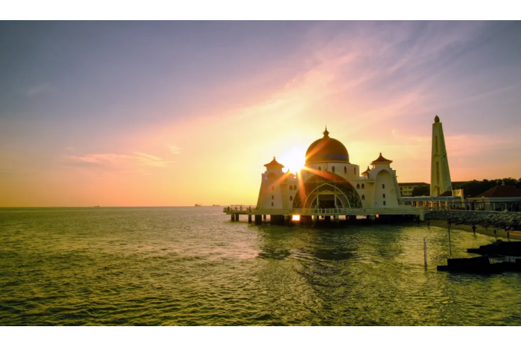 【马六甲海峡清真寺】马六甲海峡清真寺位于人工修筑的马六甲岛上。如果水位高,它看起来像一座浮动的建筑。落日余晖下的海峡清真寺很美丽,广播里传出的通经声与海浪声相互交织,夕阳西下映衬着金色的穹顶,坐在海边的堤坝上欣赏这一美景是件很惬意的事。天黑以后,清真寺会亮灯,整个建筑会变成另外一幅颜色,别有韵味。